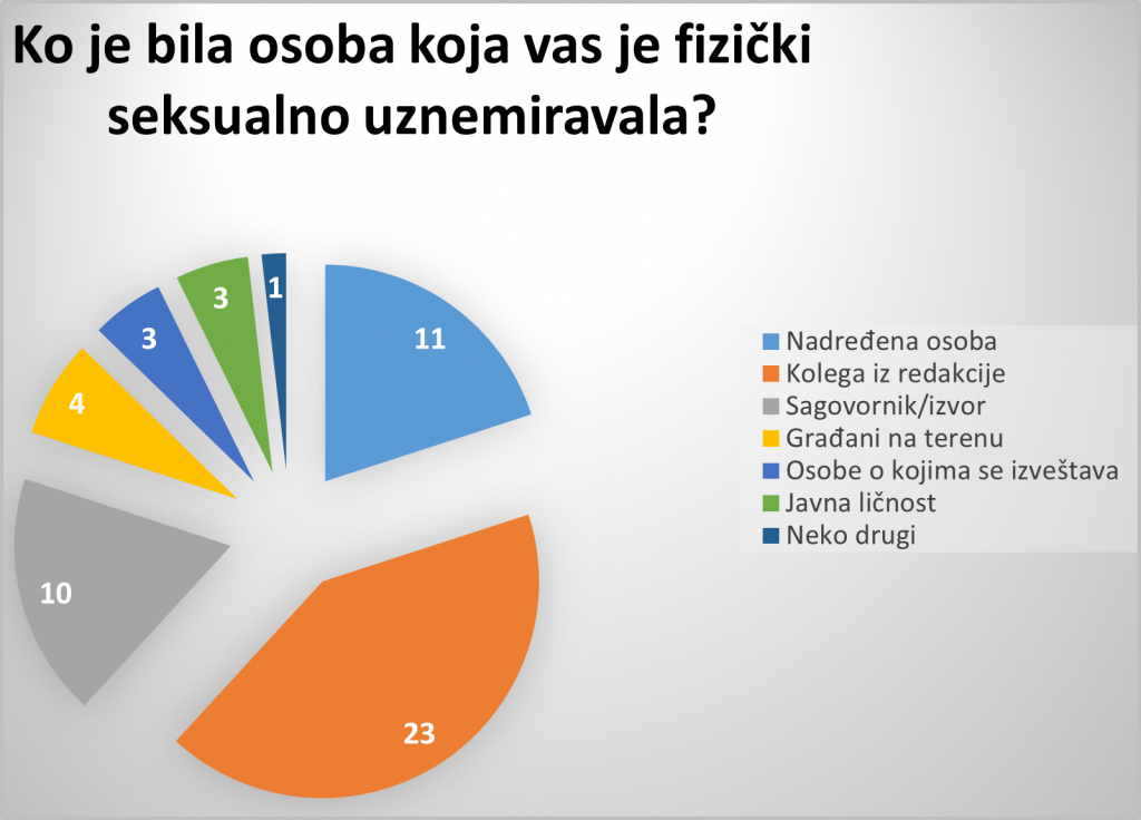 Međutim, seksualno uznemiravanje se retko i prijavljuje — jer novinarke veruju da mogu same, ili se odlučuju na prijavu tek kada situacija postane nepodnošljiva. Uznemiravanje dolazi najčešće u samim redakcijama, ali i izvan njih, najčešće od sagovornika iz akademske zajednice.